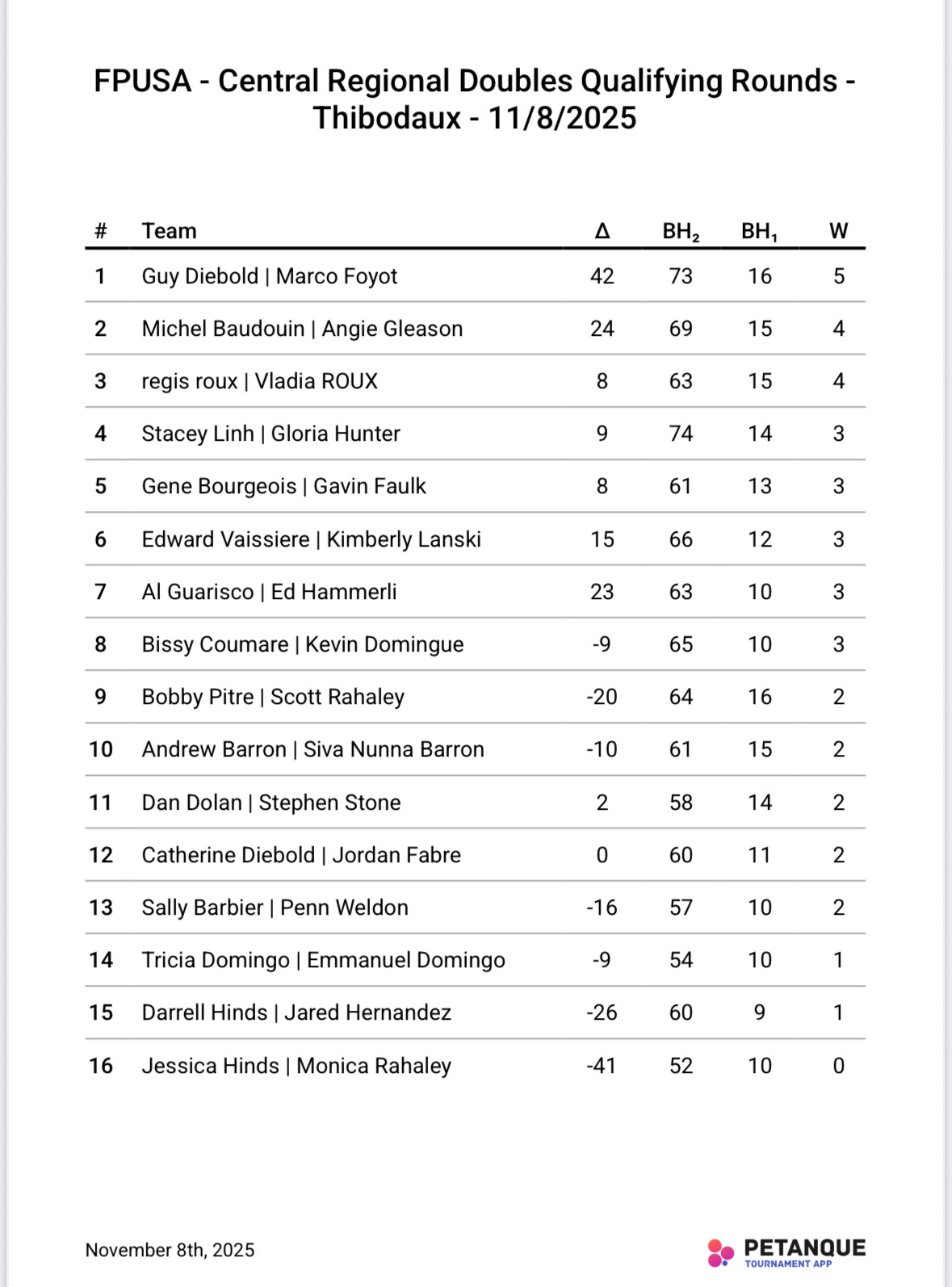 Results for the first FPUSA tournament organized in Thibodaux ! November 8-9, 2025