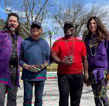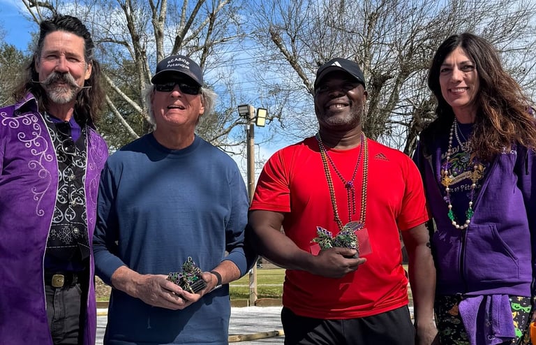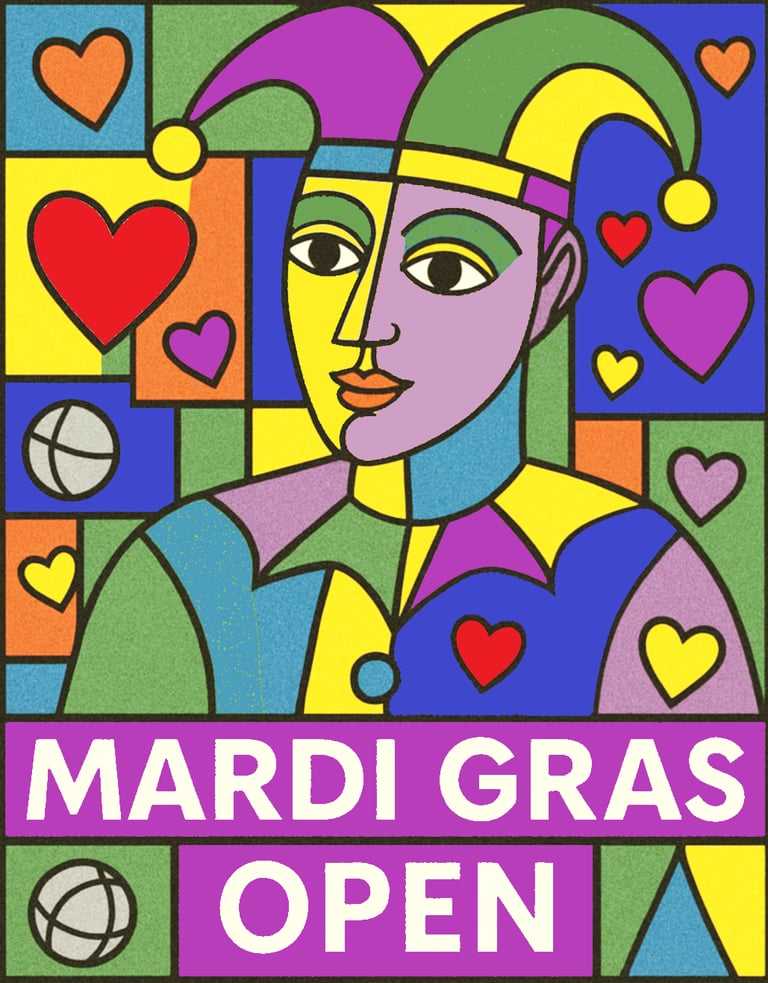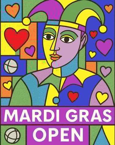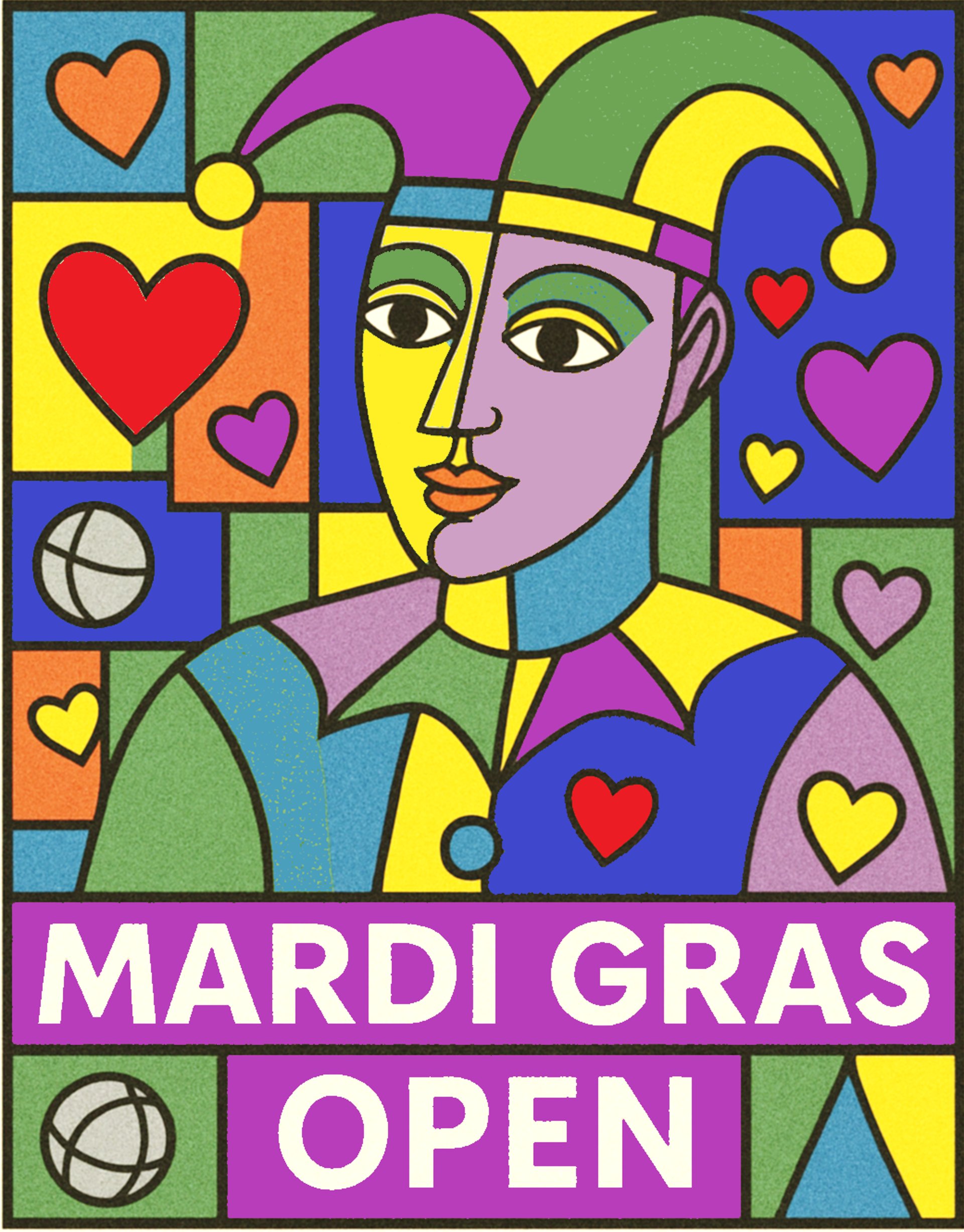 The 2026 Mardi Gras Open will feature an entire WEEKEND of pétanque and revelry. The fun starts Friday February 13, 2026 with social play and other festivities, and keeps rolling along through the two-day tournament on Saturday and Sunday, followed by local Mardi Gras parades.
