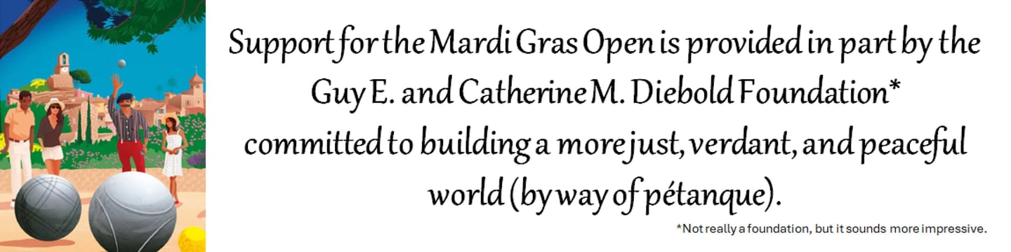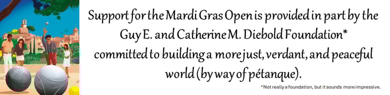 We would like to extend our heartfelt thanks to the all of the sponsors of our pétanque club. A special thank you is owed to the City of Thibodaux Parks and Recreation Department (TREC) whose ongoing support providing and maintaining our terrain is essential for our club. Additionally, we are deeply grateful to the sponsors of our Mardi Gras Open whose generosity ensured the success and comfort of everyone at the event. Your support makes all the difference, and we truly appreciate it!