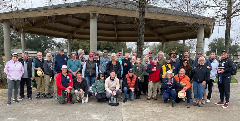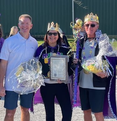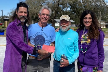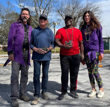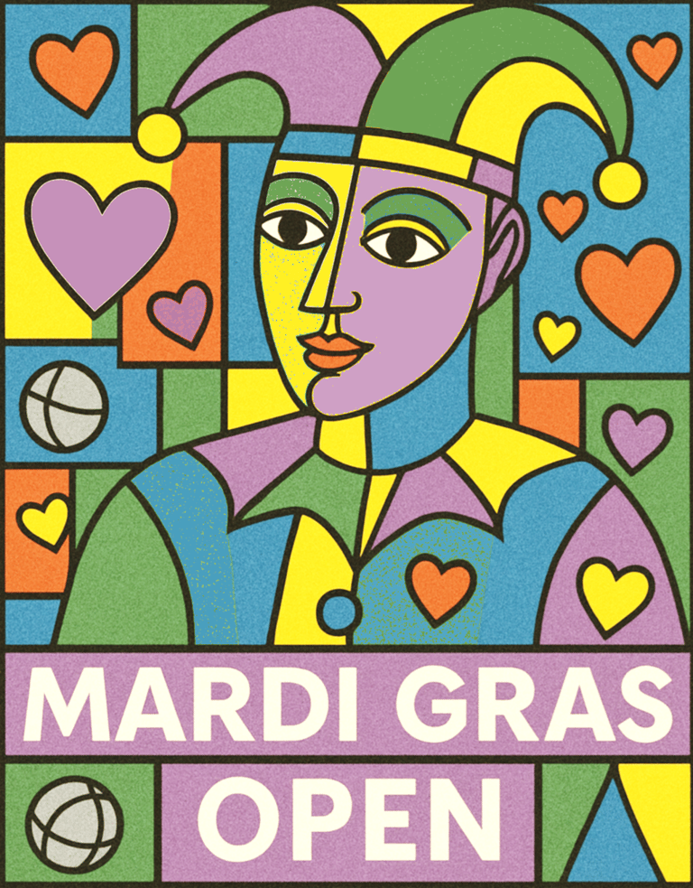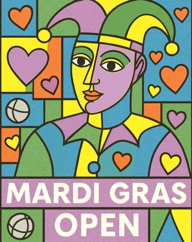 The 2026 Mardi Gras Open will feature an entire WEEKEND of pétanque and revelry. The fun starts Friday February 13, 2026 with social play and other festivities, and keeps rolling along through the two-day tournament on Saturday and Sunday, followed by local Mardi Gras parades.
